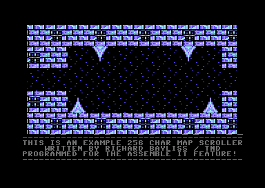Now we start the game from StartTheGame this will set up the main in game music. Then call a new synchronized loop, which will expand the sprite screen area (ExpandMSB), scroll the screen (using the vertical scrolling hard+soft scroll subroutine (Scroller), similar to the one in the previous sub chapter). Also the player control (PlayerControl)