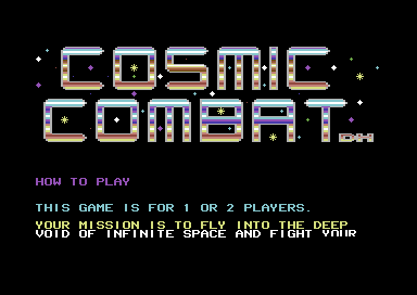 Cosmic Combat DX - Zzap! 64 Micro Action Edition Release date: 5th October 2024 Programming: Richard Bayliss, Martin Piper Graphics: Alf Yngve, Richard Bayliss, Hugues Poisseroux Music: Richard Bayliss Genre: Shoot Em Up - Vertical Scrolling Tape Loader: Freeload by Paul Hughes (With some modifications by Richard) Updates/Fixes:
