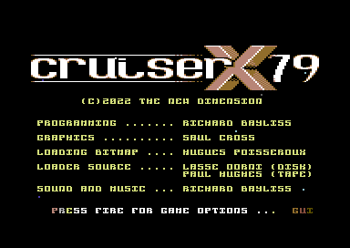Cruiser-X 79 Release date: 25th December 2022 Programming: Richard Graphics: Saul Cross, Hugues Poisseroux Music: Richard Genre: Shoot 'Em Up (Vertical Scrolling) Tape Loader: Freeload by Paul Hughes