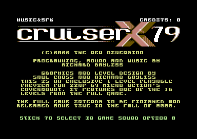 Cruiser-X 79 (Playable demo) Release date: 31st May 2022 Programming: Richard Graphics: Saul Cross Music: Richard Genre: Shoot 'Em Up (Vertical Scrolling) Tape Loader: Freeload by Paul Hughes
