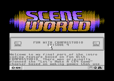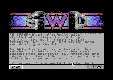 INTRO CREDITS Intro code and graphics by Black/Angels Intro Music by Richard Features: - Exclusive interview with Nordischsound - Cracking in 2023 - Evercade games collections reviewed - Itch.io report about C64 games hosted on the site - Let's Make a C64 game special - Snake vs Bomb - Fun with CBMPRGStudio V4.1.0 and much more BONUS: - Example source and binary files accompany programming tutorials - Voodoo Noter for Scene World articles - Snake vs Bomb (Full game) - Example intros for Scene World's Fun With CBMPRGStudio (For the complete project source, please visit Richard's Github Page |